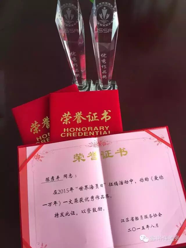 值得一提的是,八月份“世界海员日”我公司多篇优秀作品在大会上予以通报表彰,公司总经理俞志华为获奖船员代领了奖章和奖状。近期将在换人之际带都各位手中。